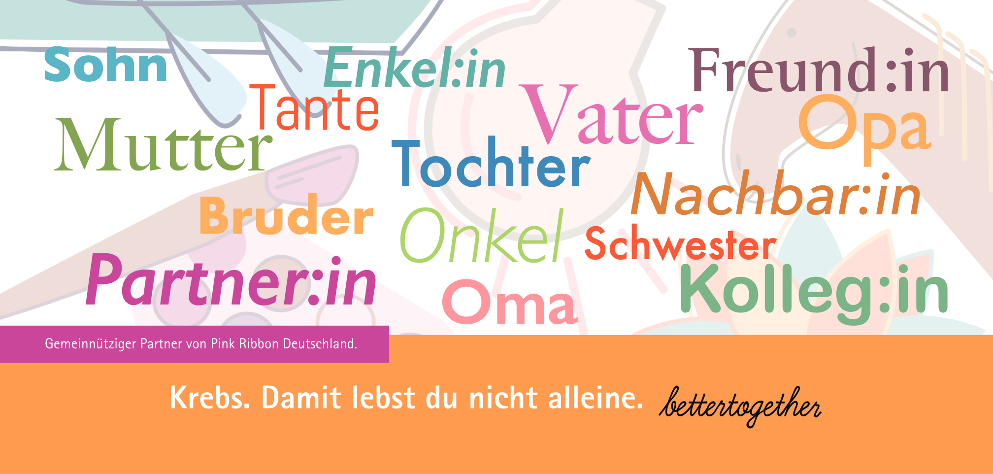 „Stark sein“ lautet die Devise, da die erkrankte Person im Mittelpunkt steht. Umso wichtiger ist es, auf sich selbst zu achten und für Entlastung sowie für Entspannung zu sorgen. Daher unterstützt Pink Ribbon Deutschland die gemeinnützigen bettertogether-Mitmach-Projekte. Wir nennen dies: Pink Ribbon Family.